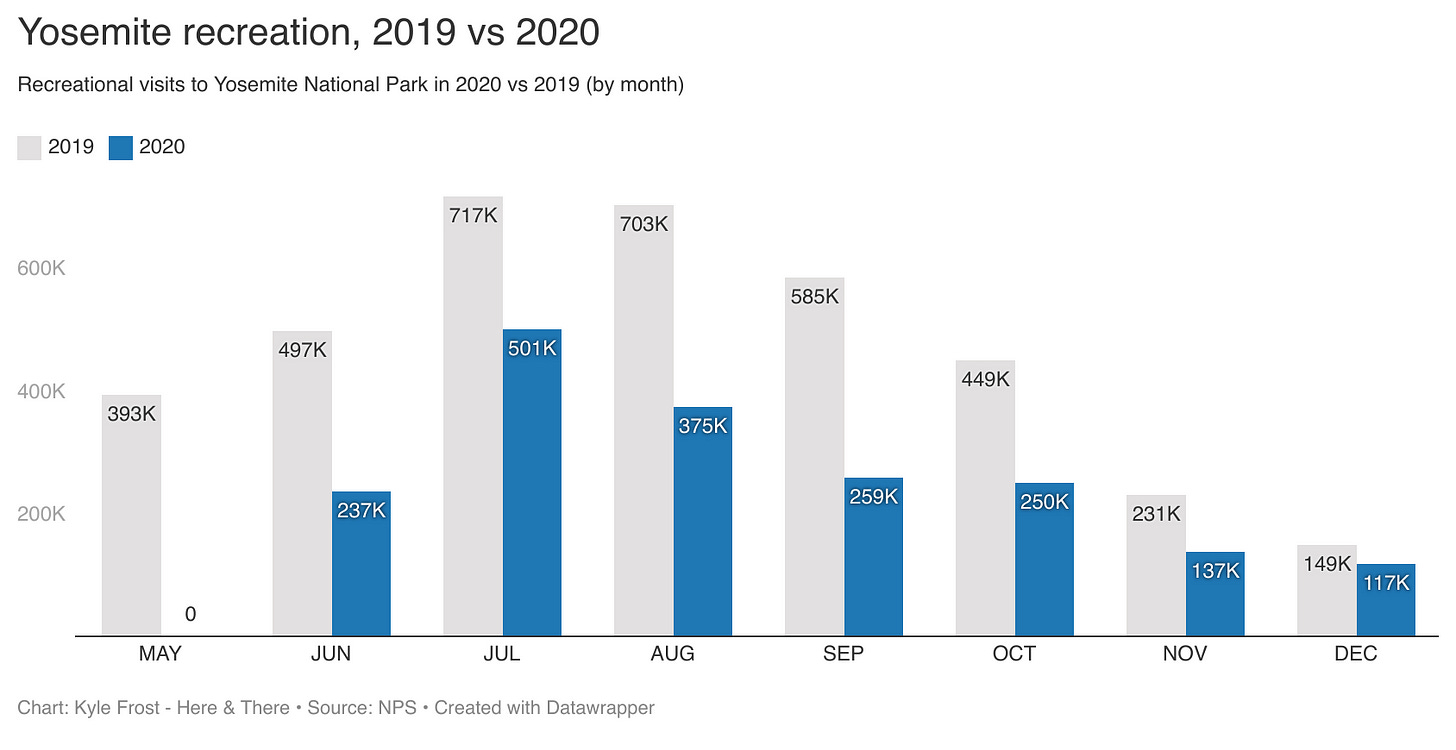 As with most things, there are trade-offs. In addition to the economic impact in surrounding communities, some parks will take a massive revenue cut from visitor fees this year. Assuming parks (on average) saw ~20-25% less visitors this year, that’s north of $70 million in lost revenue. For some parks, it’ll be an even heavier hit — because 80% of fee revenue stays in the park where it is collected, and 20% goes to parks that don’t collect fees, decreases won’t be softened by better performance in other parks.