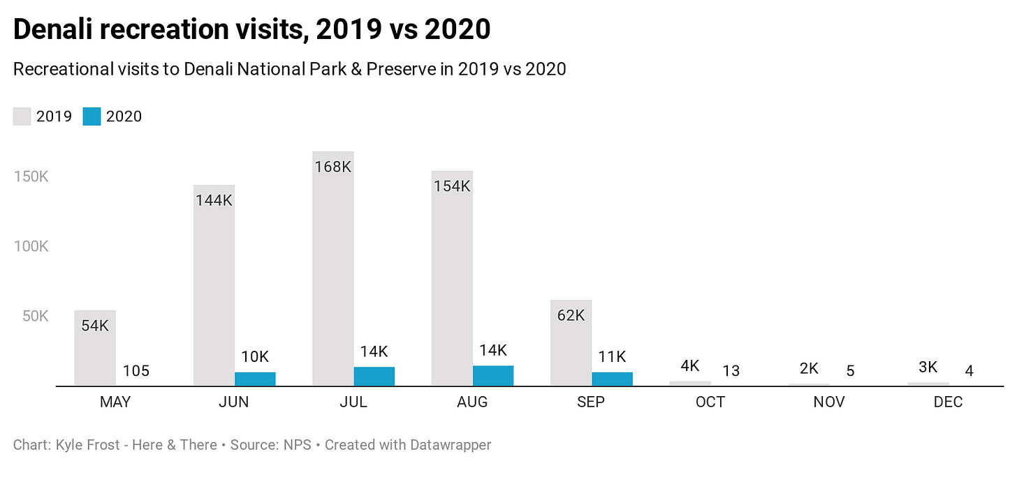 If there’s one chart that sums it up for Alaska, it’s the visitation for Denali this year. Alaska lost almost all of its expected 1.3 million cruise visitors in 2020, and inbound visitation from flights was down as well.