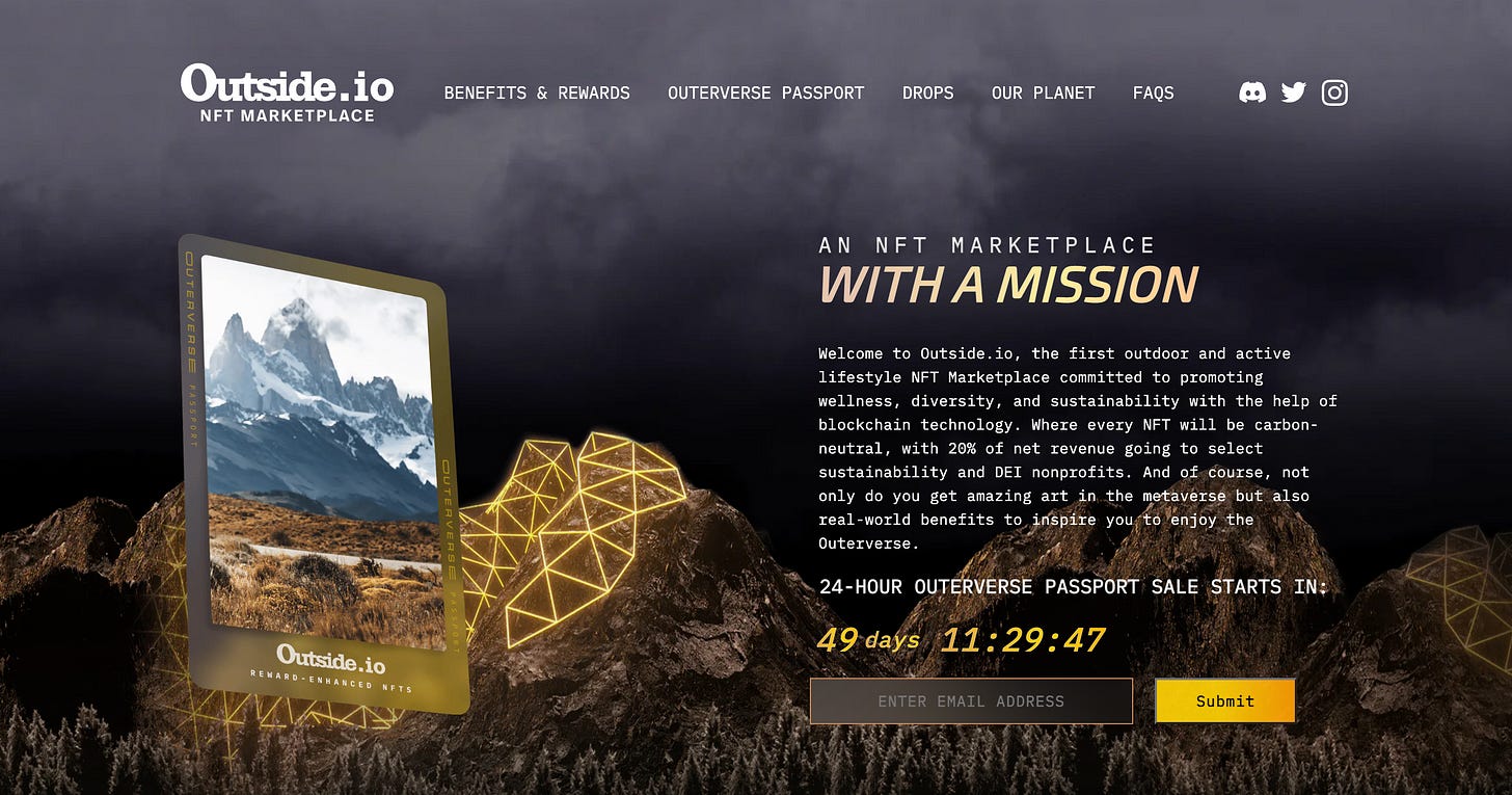 It seems like Outside is coming at this from a different direction. They’re trying to activate their existing community to build a walled garden NFT marketplace for outdoors-focused creators. It’s a far greater challenge to convert a non web3-native audience (which is most of the outdoor industry) to engage with a new marketplace. This also adds an additional hurdle of “explaining NFTs/crypto/blockchain” to your audience in order to succeed. Is the cross section of ‘Outside readers” + “interested in web3” is big enough for this to work?
