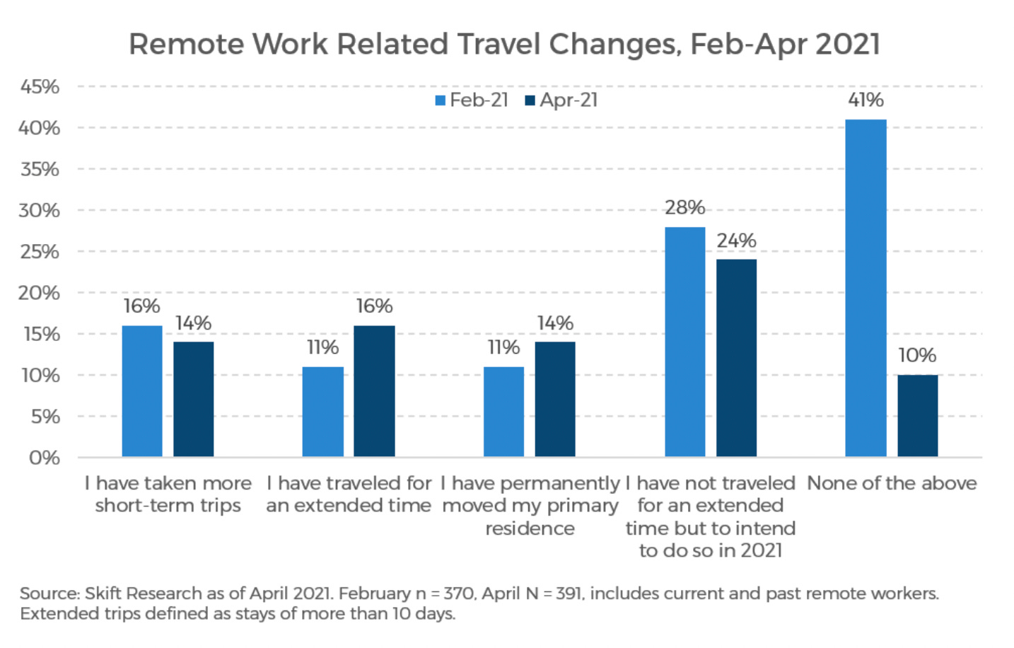 Works remotely (or company has a hybrid policy)Owns or rents a home/apartment in a place they would consider “home”.Participates in travel of 2+ weeks that include intentional work (not a vacation where you end up having to do some work). For some this might mean working during the week and then exploring on the weekends, and for others it might take the form of month-plus live/work vacations.A Skift report from June 2021 found that more than half of Americans had taken or were planning to travel as a result of being remote.