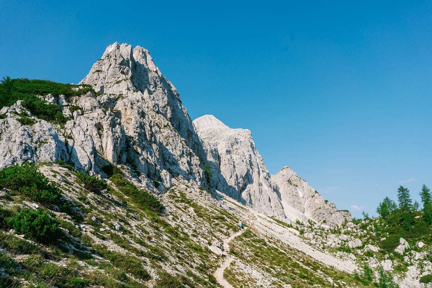 Once you reach the summit, you can descend back to the pass via the standard south route, or tack on some extra fun. I chose to continue traversing the ridgeline towards Velika Mojstovka and Zadnja Mojstrovka. This ended up being a super fun route, not too technical or scrambly but with some exposure in places. From the top of Zadnja Mojstrovka there is a steep scree descent route that eventually traverses below the ridge line and back towards the south route descent of Mojstrovka. From here it's a short hike back down to the pass where you can catch the bus.