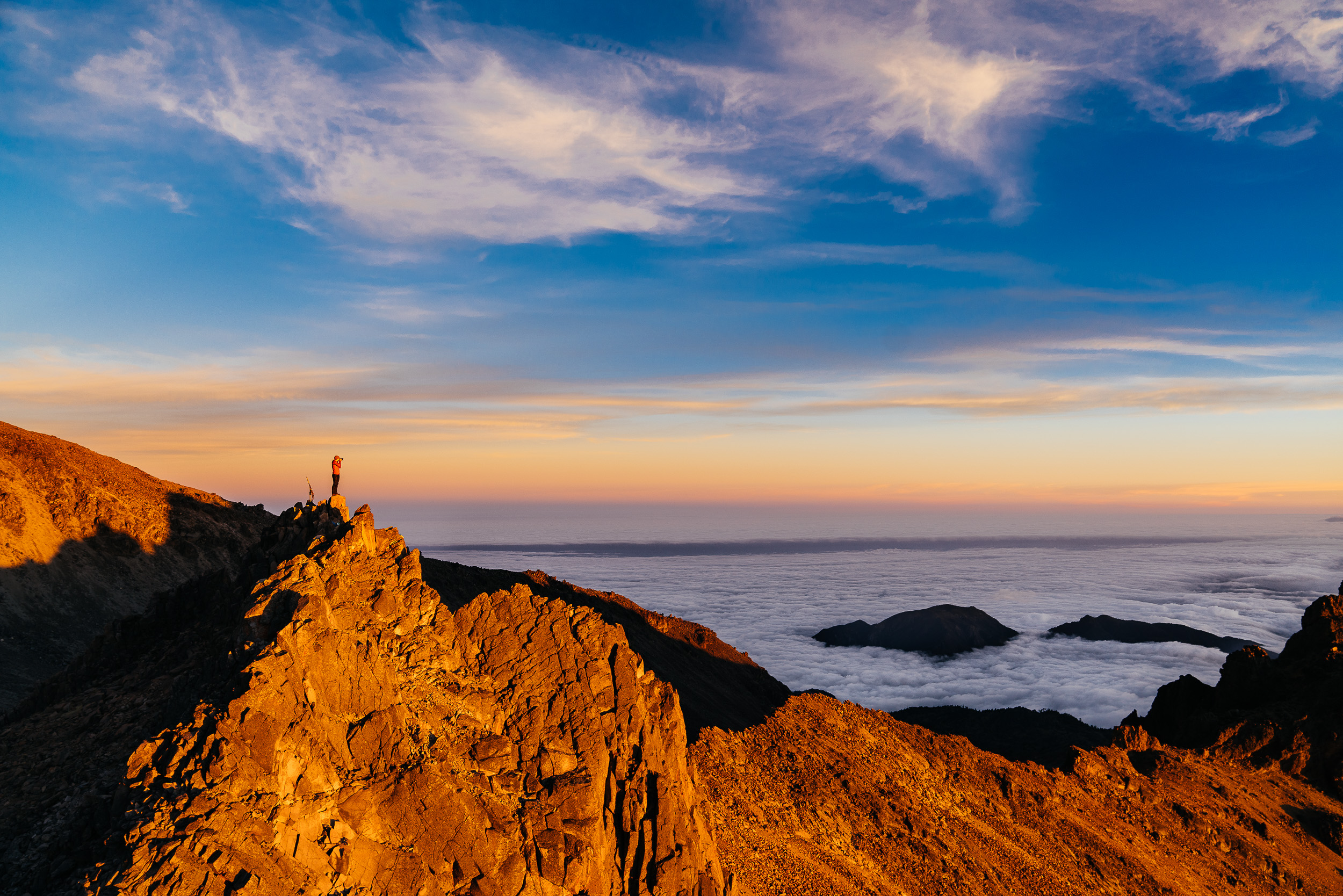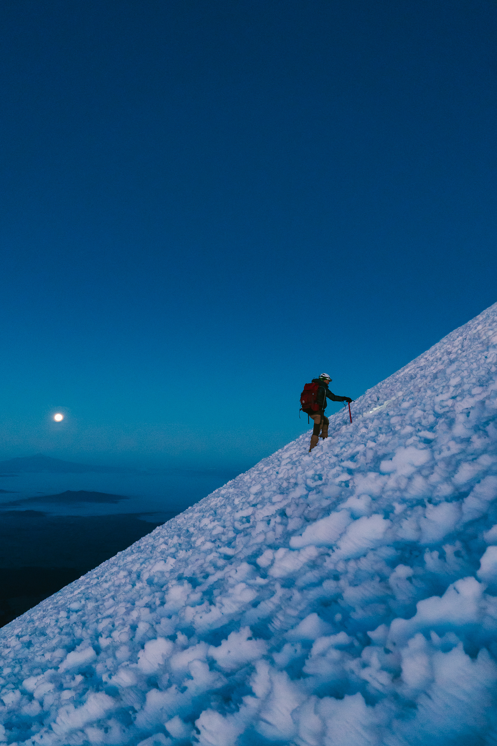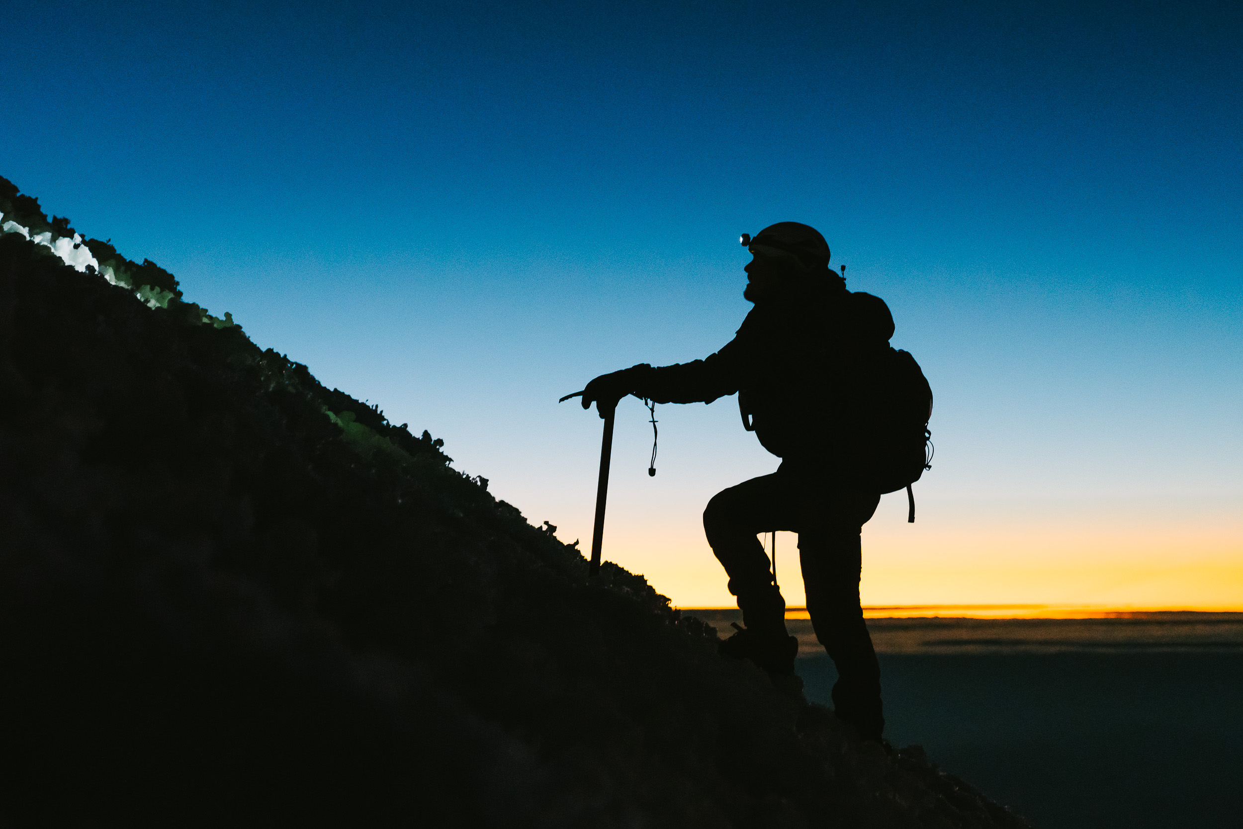The scree eventually gave way to snow, which was shaped into massive suncups on this side of the mountain. Soon, we enjoyed a wild sunrise as we neared the top. Watching the shadow of a massive volcano grow as the sun comes up is an incredible sight.