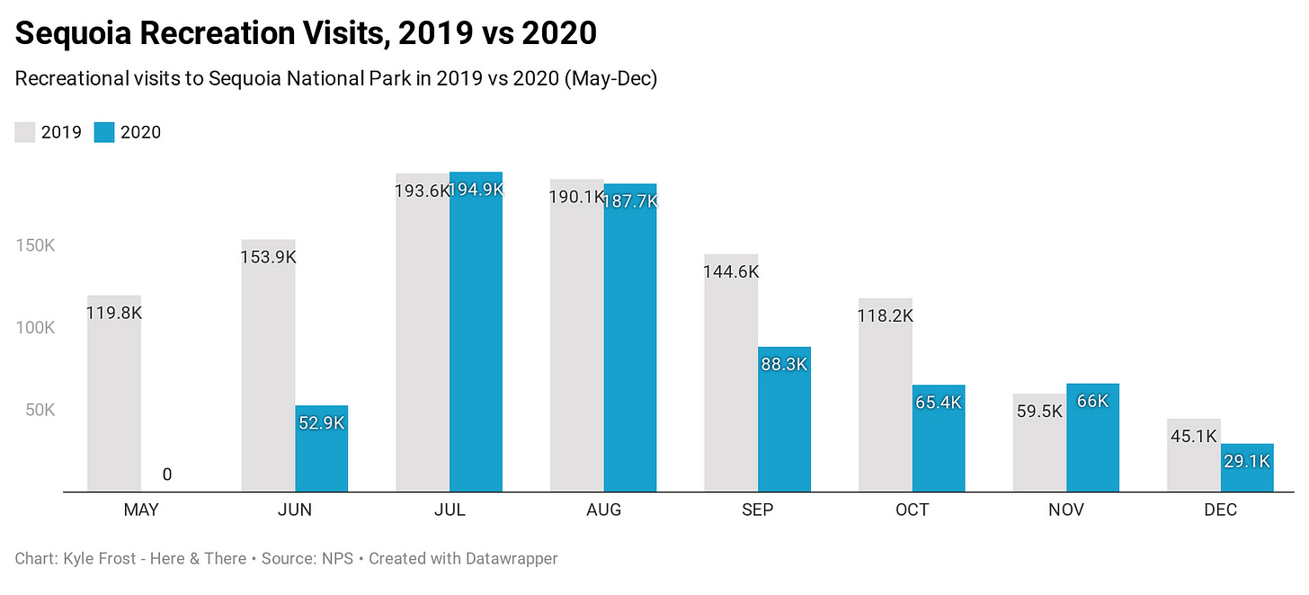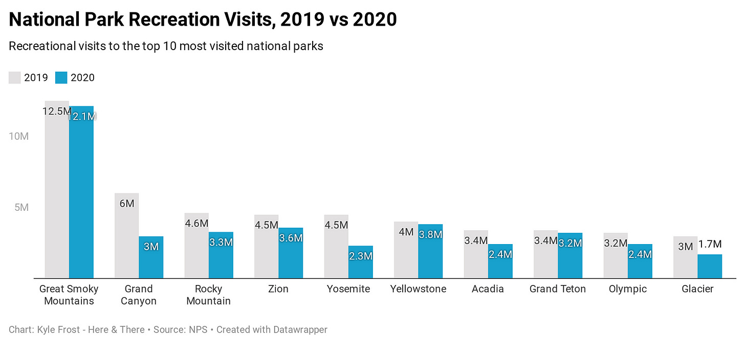 As with most things, there are trade-offs. In addition to the economic impact in surrounding communities, some parks will take a massive revenue cut from visitor fees this year. Assuming parks (on average) saw ~20-25% less visitors this year, that’s north of $70 million in lost revenue. For some parks, it’ll be an even heavier hit — because 80% of fee revenue stays in the park where it is collected, and 20% goes to parks that don’t collect fees, decreases won’t be softened by better performance in other parks.