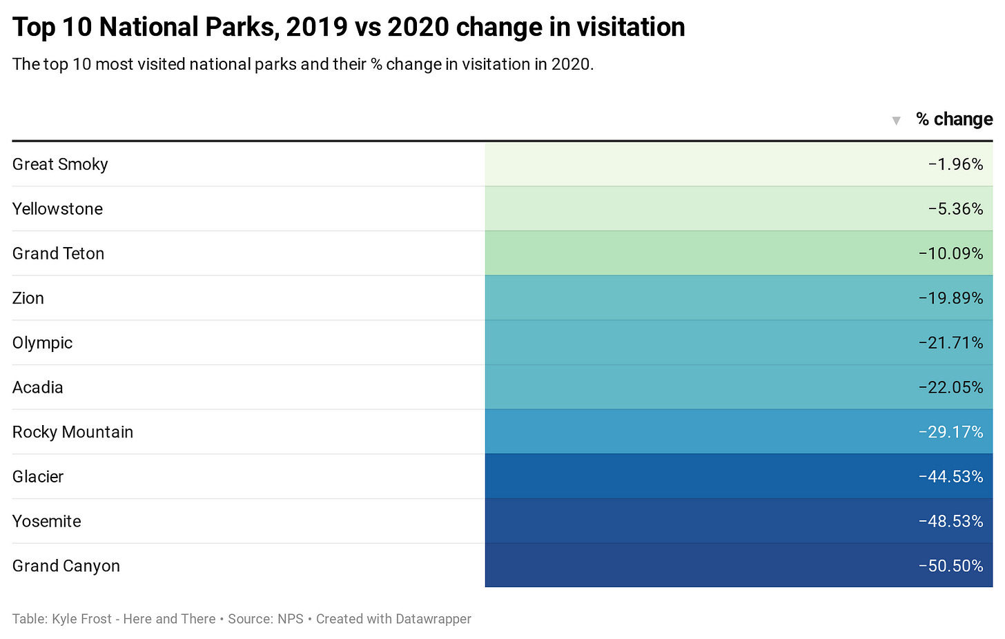All the parks saw decreased visitation. Most parks were completely closed in April (and some into May), which made it almost impossible to reach 2019’s numbers. However, many experienced record summer and fall visitation.