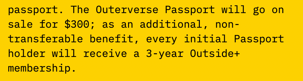 ”Outside+ members will have early access to purchase the Outerverse Passport, but the passport will be available for everyone to purchase.”