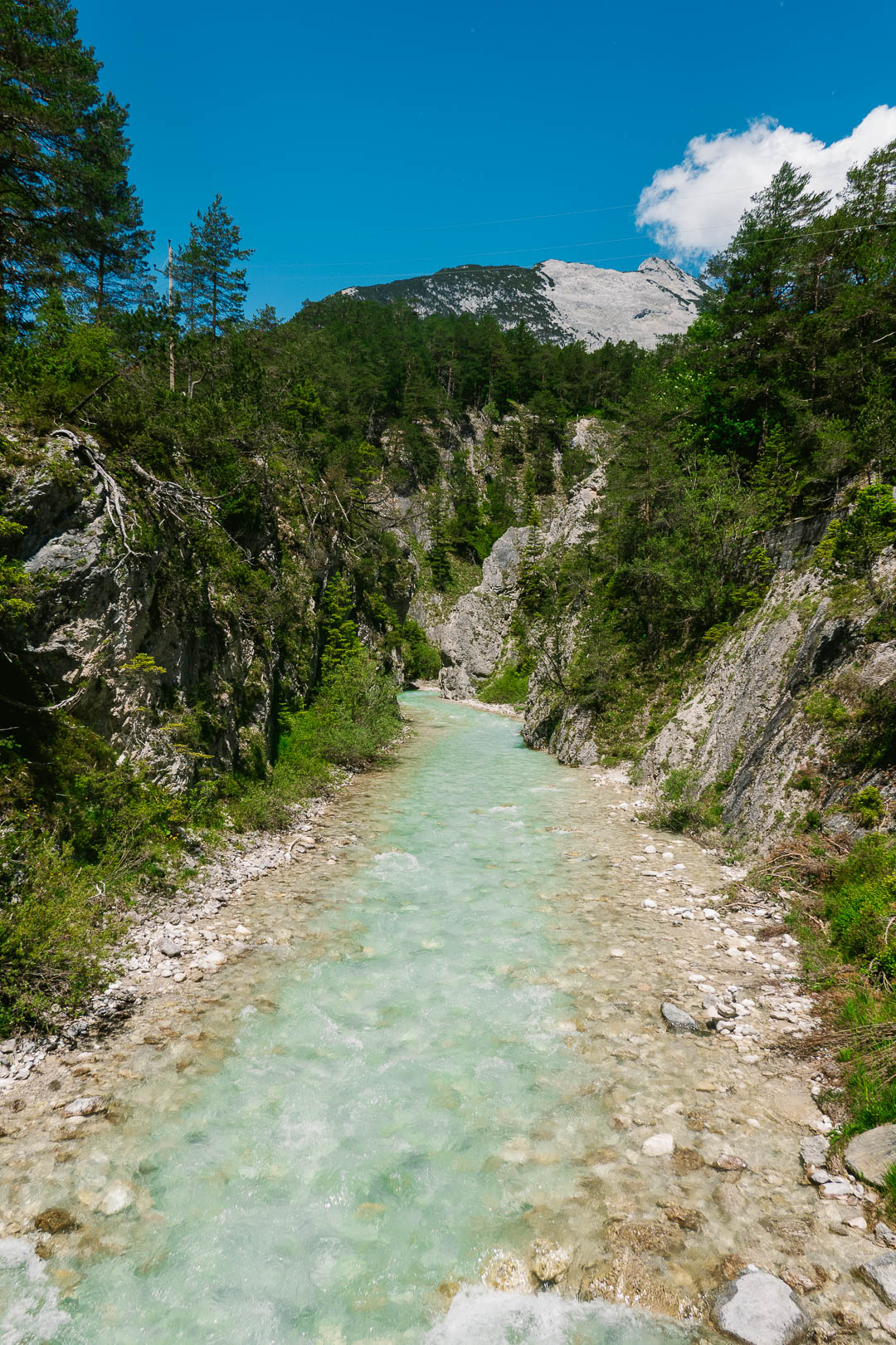 This was a cruiser day. I started by retracing my steps to Lafatscherjoch and then taking a right turn, following signage for the Hallangerhaus. A quick descent drops you into the valley, with views of the imposing granite face of Lafatscher Roßkopf. At Hallangerhaus, take a left turn and follow signs for Scharnitz. It’s a wide gravel road from here all the way to town. There are plenty of opportunities for a dip in the river on the way (very cold, but great for the legs), and a stop at Kastenalm for a snack or cold beverage. This part of the trail is e-bike city — it’s a popular day trip from Scharnitz. Put your legs on auto pilot and enjoy the long downhill grade. The last bit into town is on pavement, and I considered my hike ‘finished’ when I reached the excellent Cafe Land for a well deserved beer! From Scharnitz it’s an easy train back to Innsbruck.