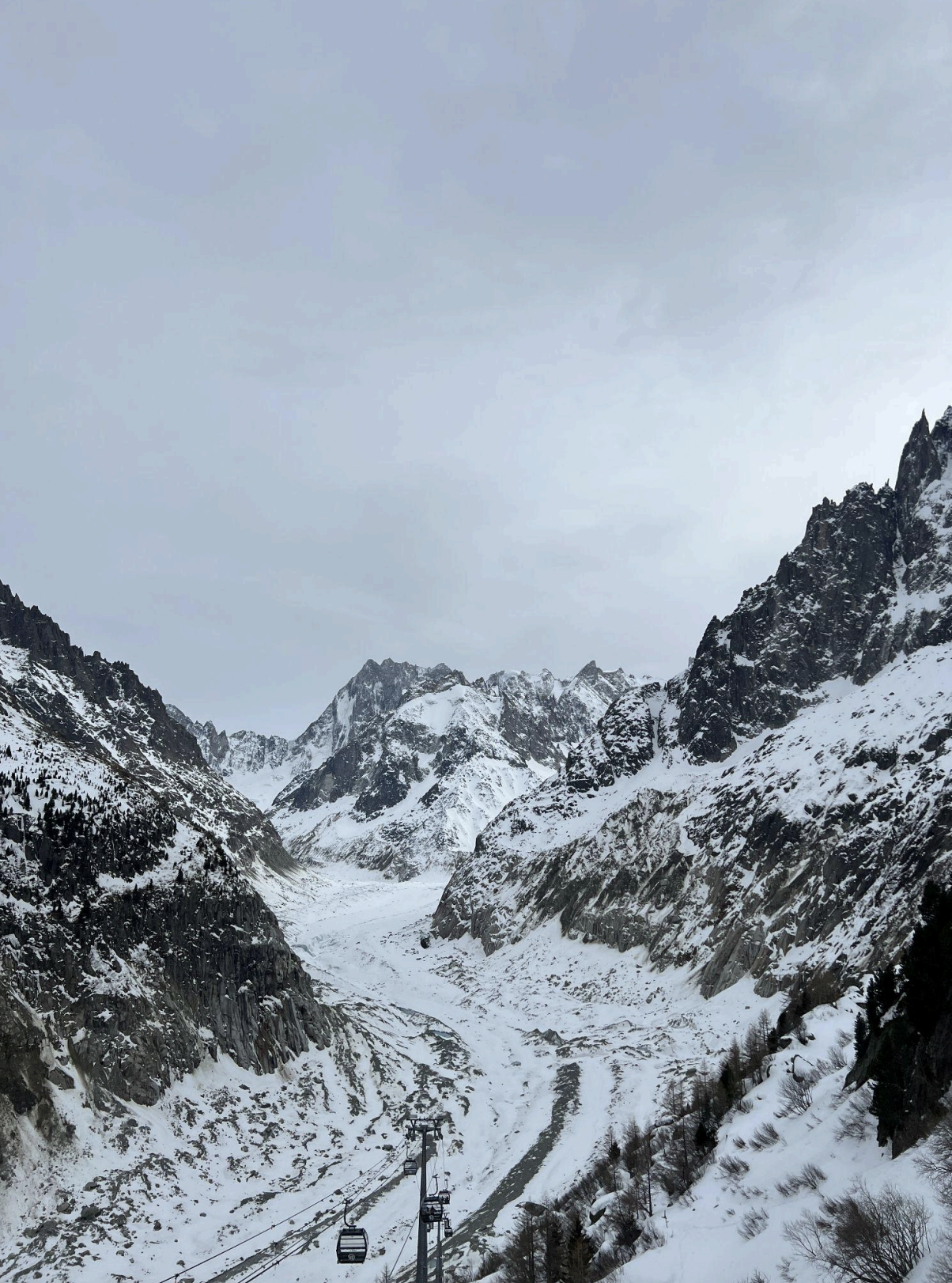 According to the Observatoire des Glaciers, the Mer de Glace, France’s largest glacier, has retreated more than 2 kilometers since 1850. Today, it loses 30 to 40 meters per year. The Montenvers train station, where we ended our ski, once sat almost level with the ice. It now requires visitors to descend a series of staircases and a cable car to reach the glacier’s surface.