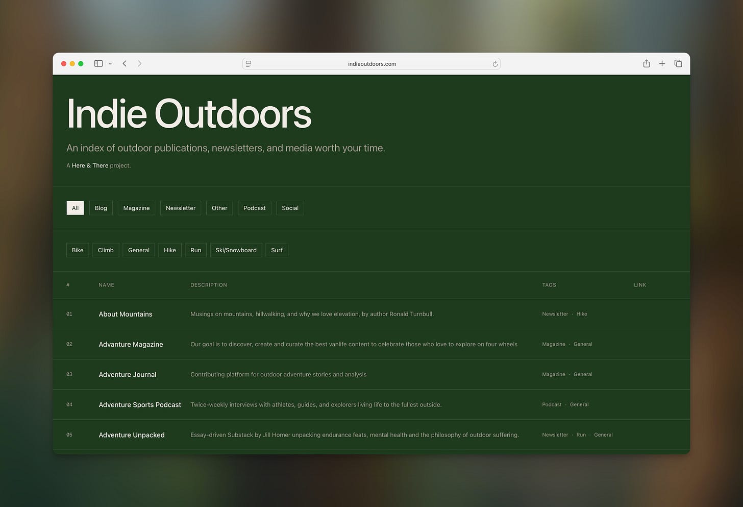While digging into the size and breadth of the indie outdoor media world recently, I realized exactly how much it has exploded. So I built Indie Outdoors, a directory of outdoor media worth your time. It’s all magazines, newsletters, blogs, and podcasts right now. It’s not comprehensive, just built off of various lists I’ve assembled over the years. Hopefully it helps people find voices and topics that actually interest them rather than PR-sicle content from the big conglomerates. And hopefully it grows with suggestions from folks who weren’t in my initial search (you can submit on the site).