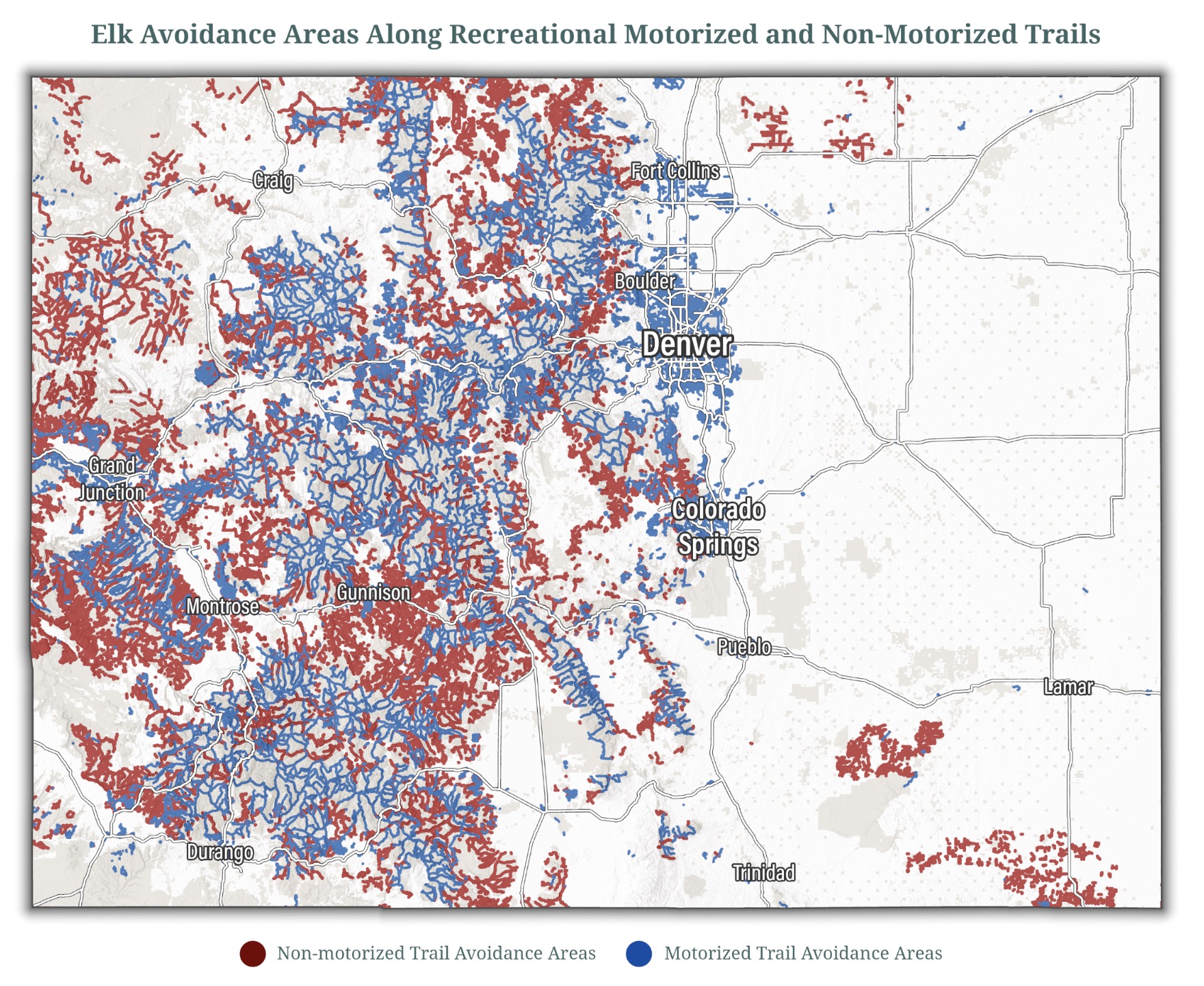 A 2022 analysis indicated that 40% of the most critical elk habitats in Colorado are already affected by recreational trail use (Theodore Roosevelt Conservation Partnership, 2022). Elk avoid hikers, mountain bike riders, and ATVs, by staying about 1,795, 2,172, and 2,884 away respectively (McCorquodale, 2013). These “avoidance areas” encompass a huge amount of land, and negatively impact critical winter habitats, migration corridors, and elk calf survival.