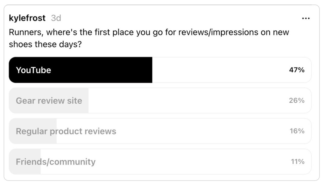 Gordon Wright, founder of Outside PR, the agency for Hoka, says that YouTube has become a valuable channel for the brands they work with. “Runtubers are critically important in the purchasing decisions of many runners. Increasingly, we’re seeing the power of multi-media creators like Believe in the Run, Road Trail Run and Doctors of Running – they combine web reviews with online, social and video content that maximizes their reach.” My own experience and (very) anecdotal research confirms this; in a quick poll to my audience on Threads, 47% of people said they go to YouTube first.