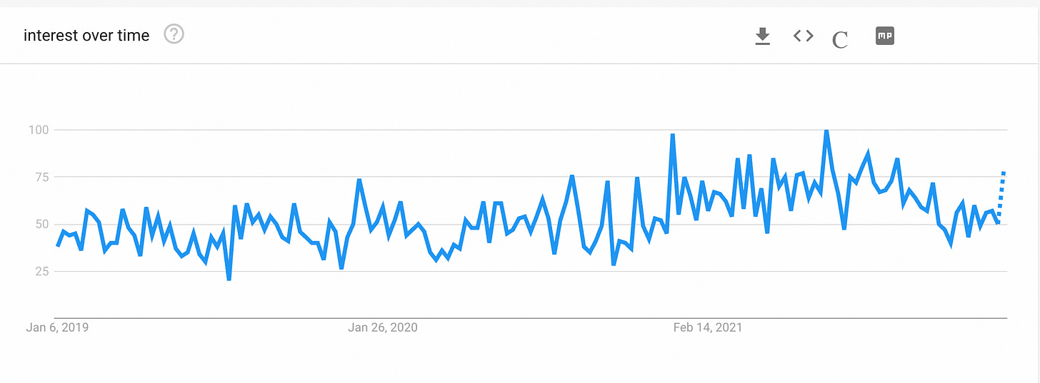 Interest on Google peaked over the summer, and has fallen a bit (possibly due to fall/winter and omicron), although I expect that trend to continue upward as we hit spring and summer 2022.