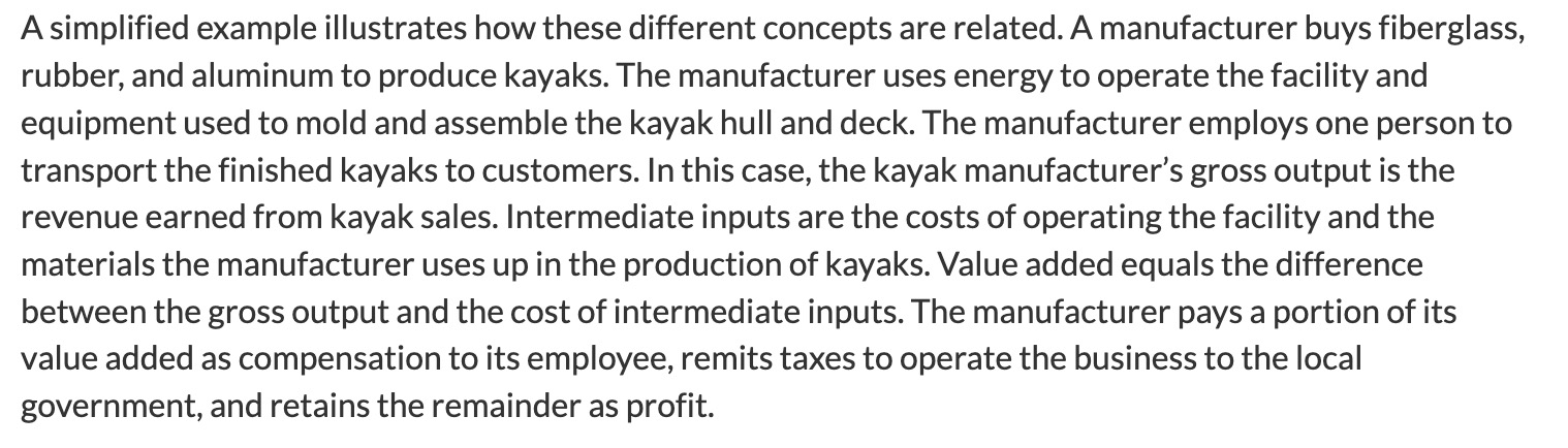 For example, the “Retail” category might include everything bought at REI, but only the sporting goods bought at Walmart. It also includes things you might not immediately expect, like the gross output from oil and gas extraction on public lands, a range of categories related to manufacturing outdoor goods, the transportation of those goods by air, water, and land, as well as finance, real estate, agriculture, construction, and more. In all, there are 95 different industry categories that make up the “outdoor recreation economy”. Here’s one example from the BEA.