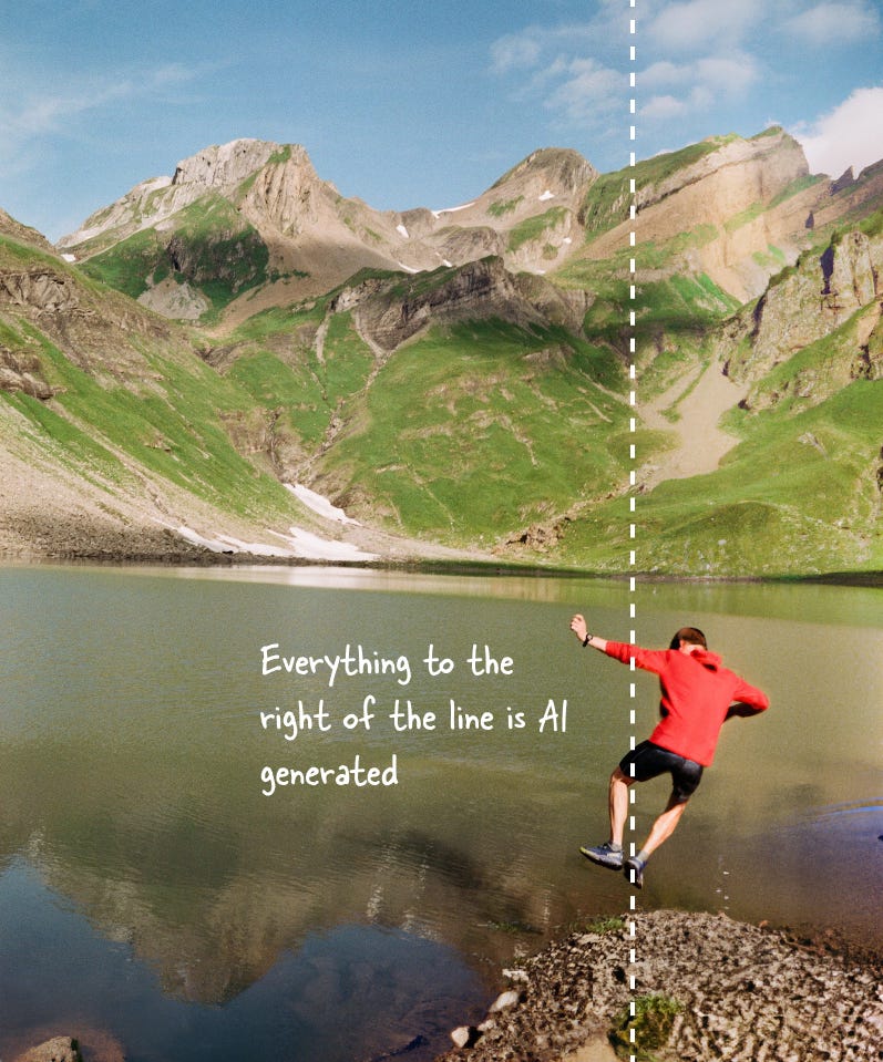 While generators are great at “generating”, it takes some skill to get exactly what you’re looking for. They sometimes have trouble with humans and faces, although you can get around this by providing reference images. Humans in motion can get a bit wonky as well. AI isn’t going to put the latest season trail shoes or the newest version/color of your puffy jacket on a well-known athlete and output a photorealistic shots of that person running in the French Alps. Yet. But it can get close…