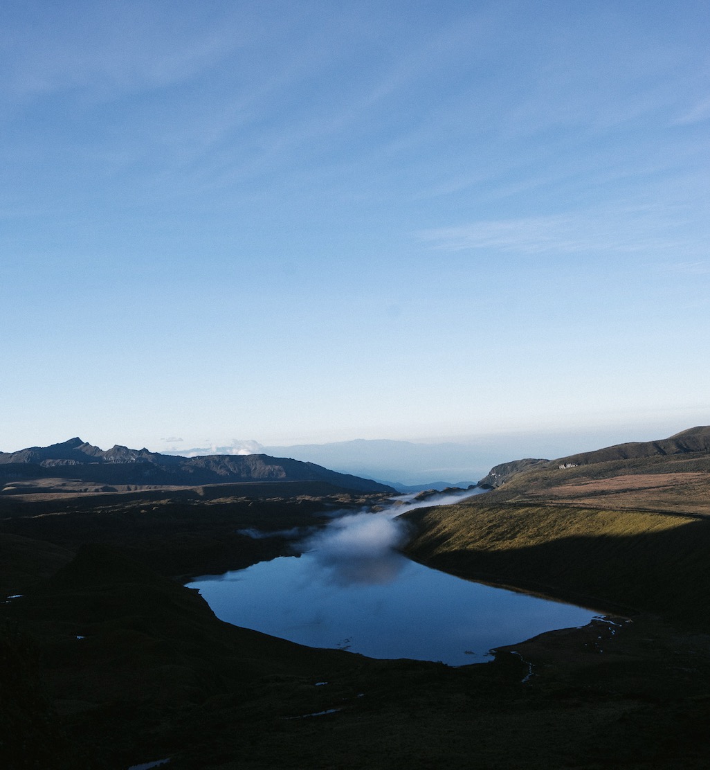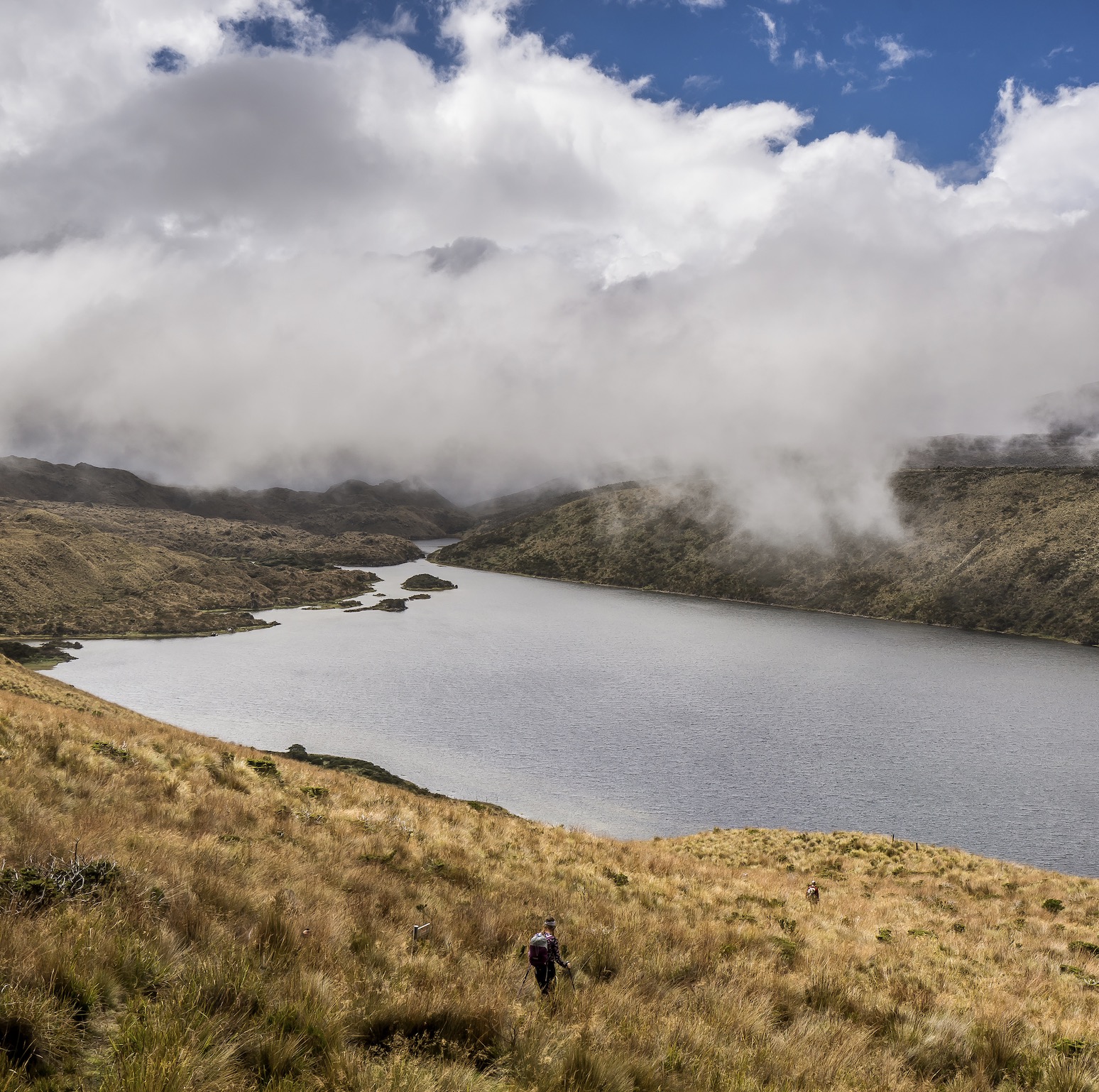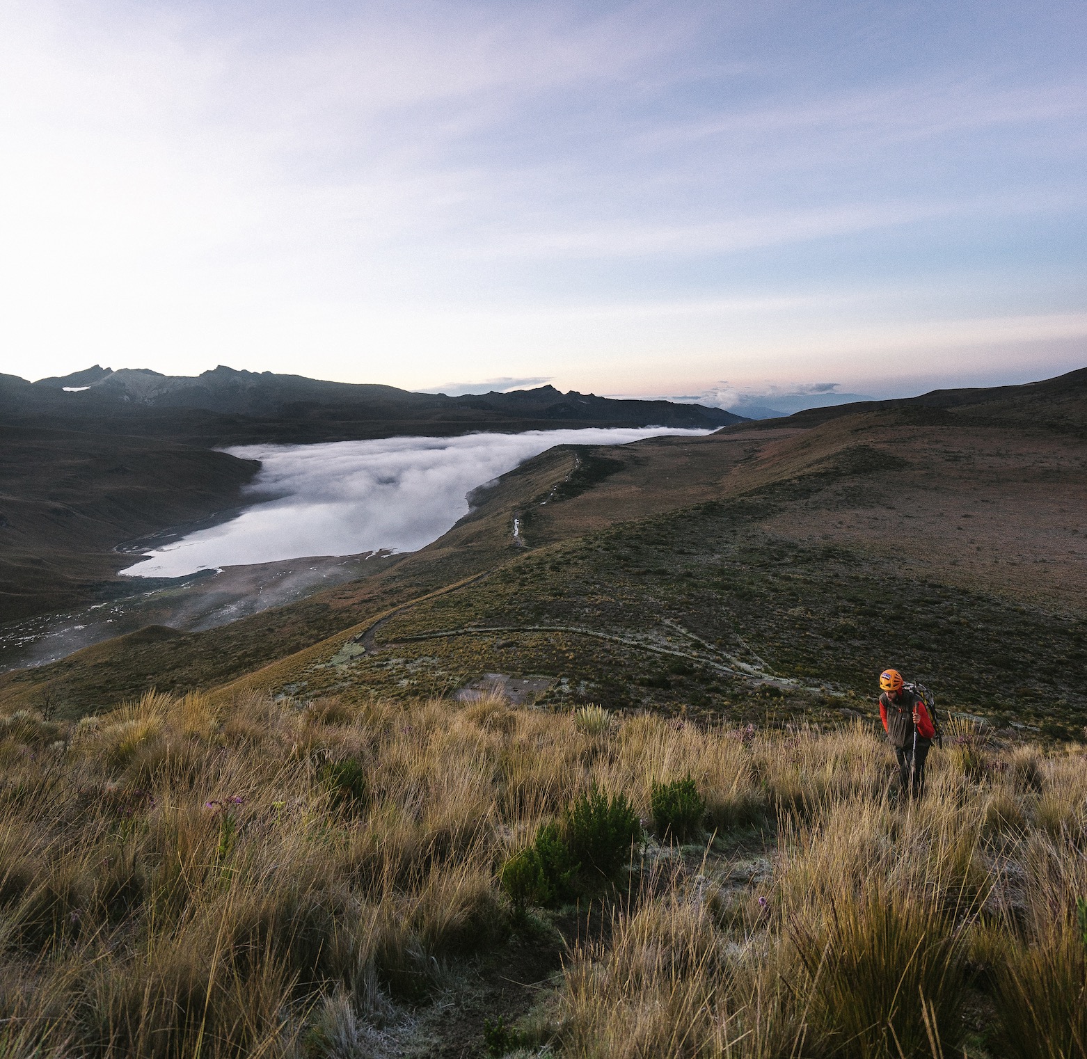 We left camp at 3am, heading around the lake towards Santa Isabel. After days of cloudy skies it was a welcome sight when we climbed above the fog to see a perfectly clear night sky above us. The sunrise swept over Laguna Otun and lit up a spectacular view of Santa Isabel, Tolima, and Quindido.