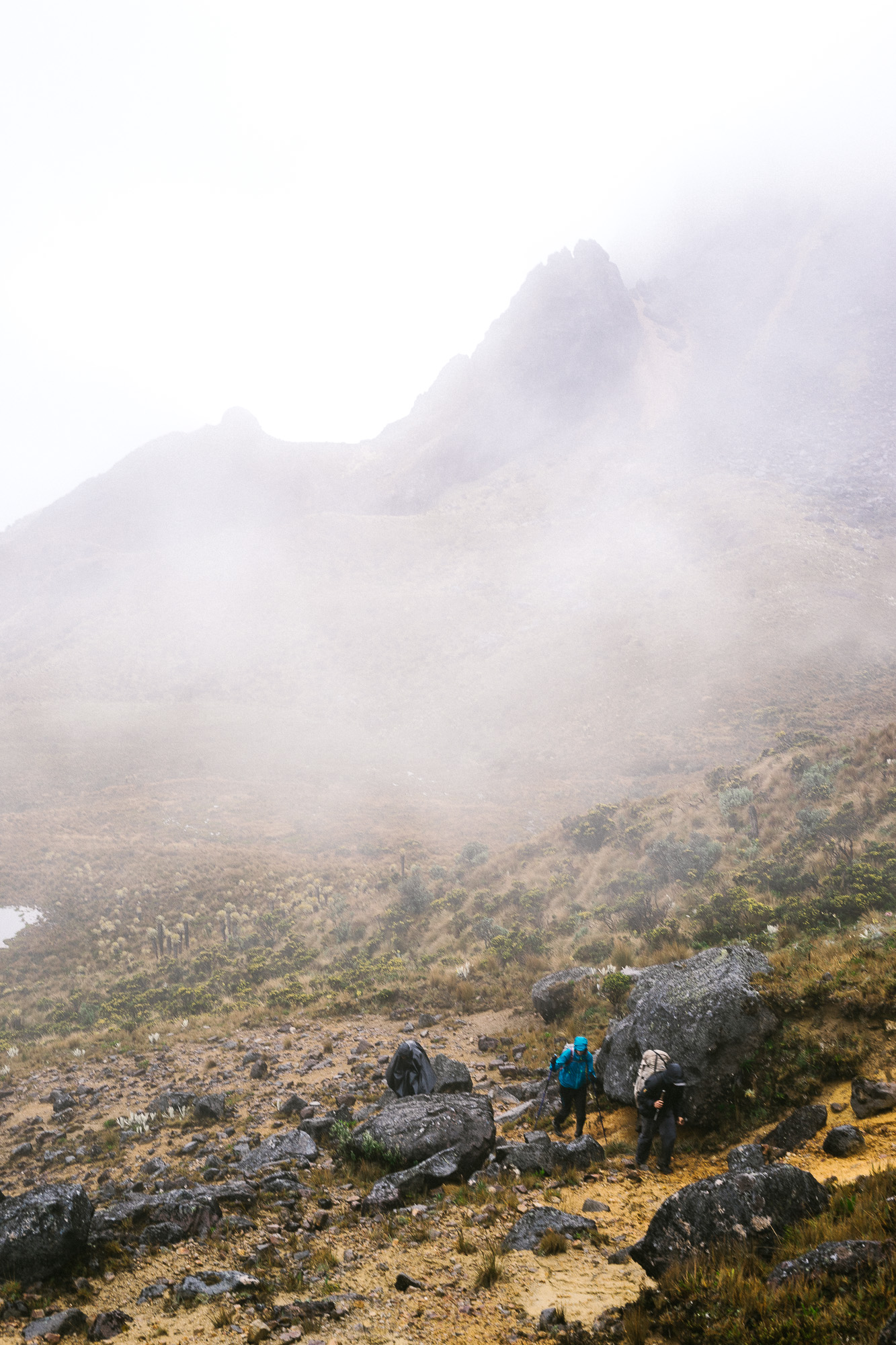 After a rather dreary first day, we were concerned that we might never see the landscapes of Los Nevados. Luckily, as we took a rather circuitous, off-trail route over another pass towards Africa, the weather cleared up a bit and we were treated to swirling clouds amongst the paramo. Our views were of endless plains broken by rugged mountains and volcanoes.
